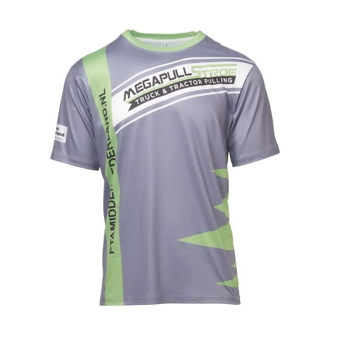 Tshirt sublimé col rond en coton polyester avec impression allover sur le devant, le dos et les manches. Créez vos propres motifs et logos avec un nombre illimité d’options de couleurs.