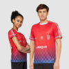 Maillot raglan sublimé à col rond selon votre design. Vous pouvez choisir entre le polyester standard et le tissu en maille plus respirant.