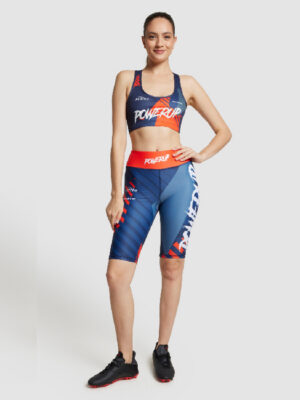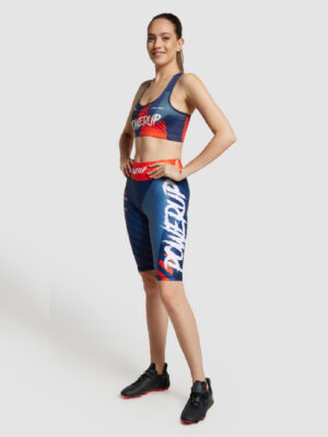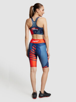 Legging court taille haute de qualitĂ© supĂ©rieure sublimĂ© en tissu extensible dans les 4 sens, doux et Ă©vacuant l’humiditĂ©. Polyester 220 gsm avec 18 % d’Ă©lasthanne.