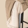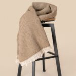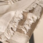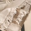 65% coton, 35% lin. Dimensions : 135 x 180cm (variations possibles selon la complexité du tissage). Produit lavé. Fouta avec franges aux extrémités. Tissage double face avec effet de matière, dont une face plus claire dans des tons beiges.