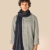 50% coton, 50% viscose. Chèche tissé avec franges, orné de rayures marine et beige contrastées. Tissés artisanalement, nos chèches peuvent présenter de légères variations de couleur d’une pièce à l’autre, signe d’un savoir-faire authentique.