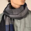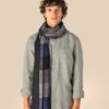 100% viscose. Chèche tissé avec franges. Tissu double face réversible : une face à petits carreaux contrastés, l’autre ornée d’un quadrillage plus large dans des tons de beige, bleu et gris. Tissés artisanalement, nos chèches peuvent présenter de légères variations de couleur d’une pièce à l’autre, signe d’un savoir-faire authentique.