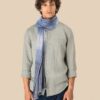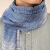 100% coton. Chèche tissé avec franges, orné de motifs graphiques aux fines rayures bleues et beiges. Tissés artisanalement, nos chèches peuvent présenter de légères variations de couleur d’une pièce à l’autre, signe d’un savoir-faire authentique.