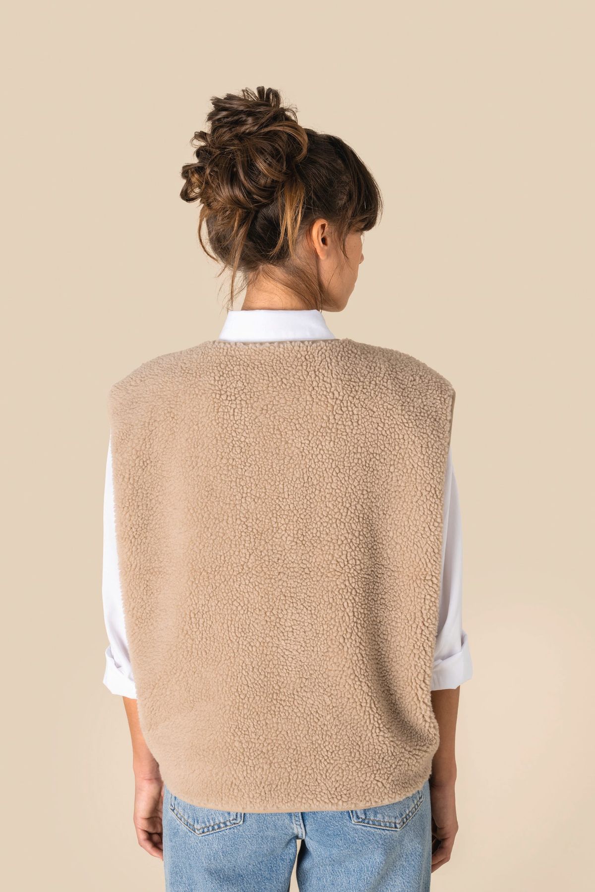 100% polyester. Coupe oversize. Matière en sherpa avec doublure principale en jersey. Fermeture par boutons pressions ton sur ton. Deux poches passepoilées devant. Finition en biais ton sur ton à l’encolure, aux emmanchures, au milieu devant et en bas de vêtement. Zip de personnalisation intérieur en bas de vêtement.