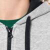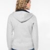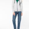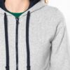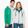80% coton / 20% polyester. Coton peigné. Molleton gratté. Passe fil écouteurs dans la poche kangourou et encolure. Bord-côte bas de manches et de vêtement. Capuche doublée et contrastée avec cordon de serrage. Zip contrasté.