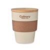 Gobelet simple paroi en PP avec bande de protection en liège et couvercle en bambou. Capacité : 300 ml. S’agissant d’un gobelet à simple paroi, le transfert de chaleur peut se produire. Le bambou est un produit naturel, et présente de légères variations de couleur, de décoration et de tailles.
