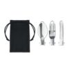 Set d’ustensiles de camping 3 pièces en acier inoxydable dans une pochette RPET.