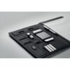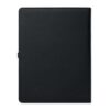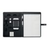 Porte-documents A4 en lin-PU avec fermoir. Chargement sans fil DC5V/1A. Powerbank de 4000 mAh avec un connecteur micro USB vers type C. Bloc-notes de 20 feuilles lignées. Porte-cartes. Porte-stylo. Plaque en aluminium noir idéale pour votre logo.