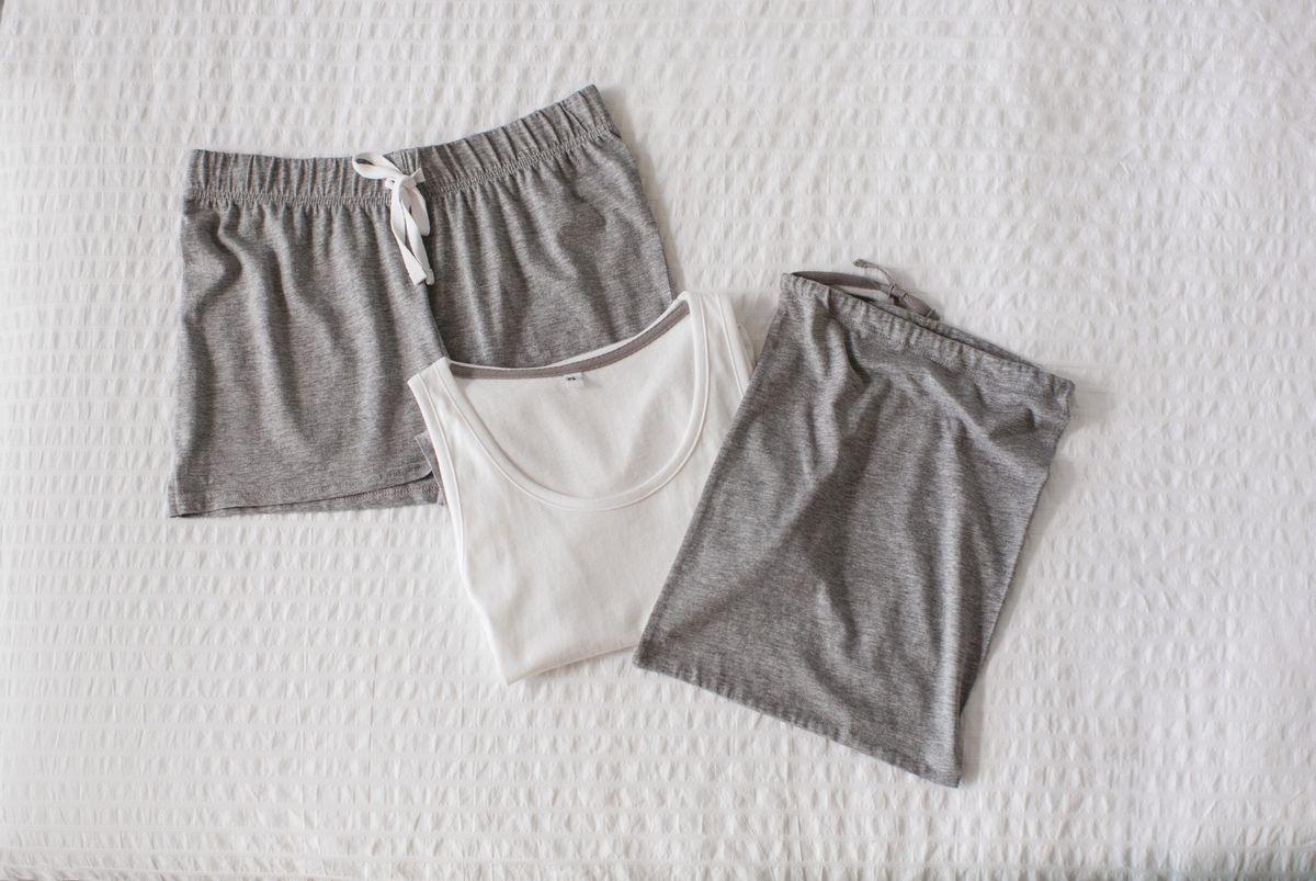 Single Jersey 100% coton (Heather Grey : 85% coton / 15% viscose). Kit Pyjama comprenant : 1 débardeur White dos nageur + 1 short avec taille élastiquée et un sac avec cordon assorti.