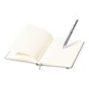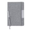 Cahier recouvert de polyester 300D RPET avec 100 feuilles lignées et élastique en caoutchouc. Comprend un stylo à bille en métal recouvert de polyester RPET, encre bleue. Labélisé RPET et Format A5. Matieres : : 300D Polyester PET recyclé , Métal , Papier , Caoutchouc.