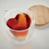 Tasse en verre borosilicate à double paroi en forme de cœur et couvercle en bambou. Capacité : 180 ml. Le bambou est un produit naturel, et présente de légères variations de couleur, de décoration et de tailles.