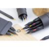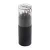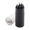 Ensemble de 12 crayons de couleur en bois noir dans un étui rond en carton noir avec taille-crayon en plastique. Matieres : : Bois , Plastique , Carton.