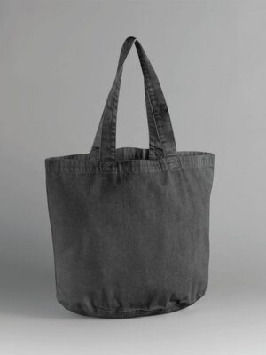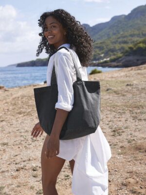 100% coton recyclé. Base ovale. Coutures à double aiguille avec poignées de transport en tissu. Peut être porté à la main ou sur l’épaule.