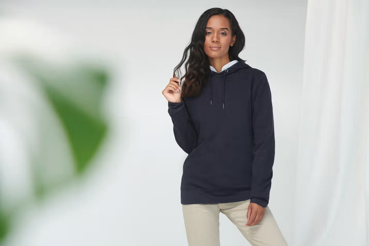 60% coton / 40% polyester. Coton régénéré / polyester recyclé. Coupe standard. Polaire brossée au dos. Manches montées. Capuche 3 pièces avec cordon de serrage et extrémités métalliques. Poignets et ourlet côtelés. Empiècement en V au niveau de l’encolure.