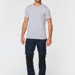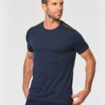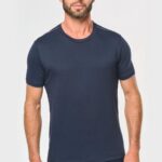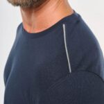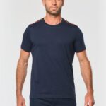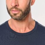 65% polyester / 35% coton peigné. Tissu jersey. Lavable à 60°C. Traitement antiboulochage. Encolure ronde avec élasthanne. Passepoil contrasté intérieur col et épaules. Finition bas de manches en bord-côte avec liseré contrasté. Finition double aiguille au bas de vêtement. Idéal pour une utilisation quotidienne.