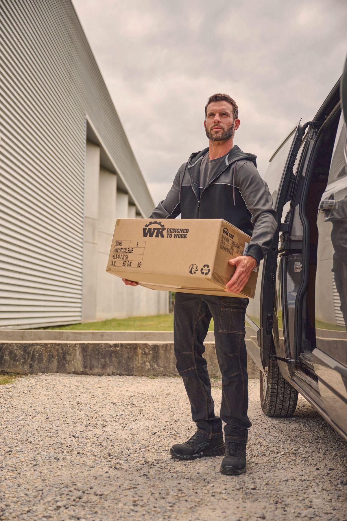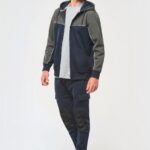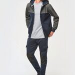 60% coton / 40% polyester recyclé. Tissu empiècements : Softshell 2 couches déperlant 95% polyester / 5% élasthanne. Coupe droite. 2 poches kangourou. Capuche en 2 parties avec cordon de serrage rond avec embouts en caoutchouc. Empiècements devant, dos et hauts de manches en tissu contrasté. Fermeture zippée ton sur ton devant. Demi lune dos en softshell. Passepoil contrasté Silver sur empiècements devant et manches. Lien d’accrochage et bande de propreté en chevron Silver dans le col. Bas de manches et de vêtement en bord-côtes tubulaire 2 x 2. Etiquette de marque détachable.