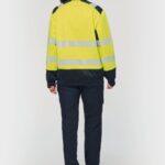65% polyester recyclé / 35% coton. Coton peigné. Molleton gratté. Traitement anti boulochage. Lavage 60°C (25 cycles). Coupe droite. Empiècements épaules contrastés avec bande segmentée rétro réfléchissante de 5 cm. Col doublé 100% polyester recyclé en bord côte 1×1. Empiècement dessous de bras contrasté. 2 bandes segmentées rétro réfléchissantes de 5 cm devant, dos et manches. Bas de manches et bas de vêtement contrastés. Finition bord côte 1×1 contrasté 100% polyester recyclé au bas de manches et bas de vêtement. Certifications en cours : EPI Classe II. Normes NF EN 13758-1+A1:2007 + NF EN 13758-2+A1:2007 : Protection UPF40+ (Propriété de protection contre le rayonnement UV solaire), NF EN ISO 13688:2013 + NF EN ISO 13688/A1:2021 (Vêtements de protection – Exigences générales), NF EN ISO 20471:2013 + NF EN ISO 20471/A1:2017 : Classe 2 (Vêtements à haute visibilité – Méthodes d’essai et exigences), RIS-3279-TOM Issue 2:2019 uniquement pour la couleur Hi Viz Orange/Navy (Norme de l’industrie ferroviaire). Etiquette de marque détachable.