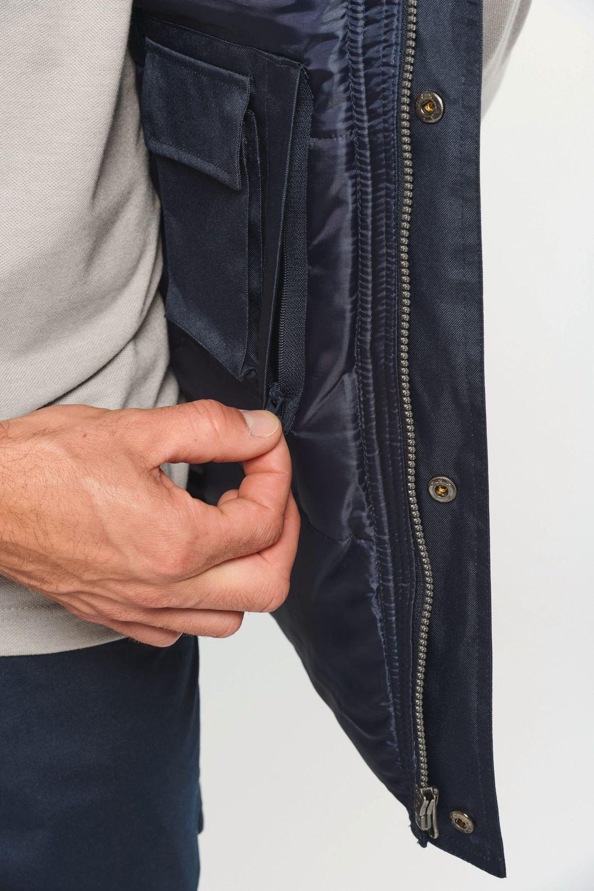 100 % polyester. Extérieur : 100% polyester Oxford avec enduction PVC. Doublure matelassée avec ouate 100% polyester. Fermeture zippée sous patte pressionnée. 4 poches extérieures (3 poches rabat et une poche zippée). Bande de serrage élastique avec stoppeurs à l’emmanchure (cachée). 2 poches intérieures (1 zippée et 1 pour le téléphone portable). Ouverture par zip intérieur pour personnalisation.