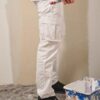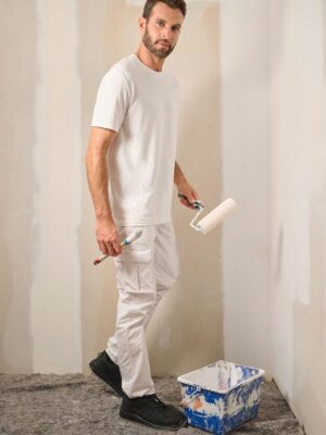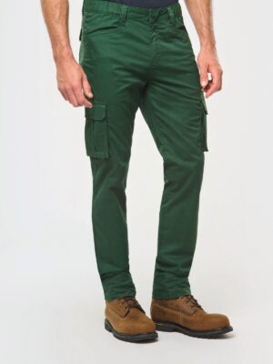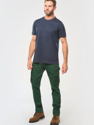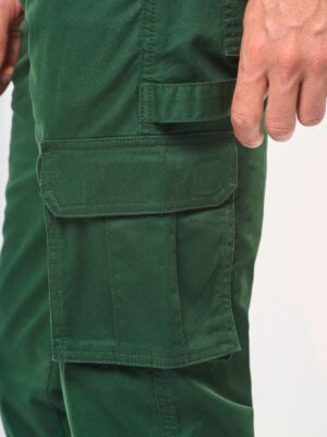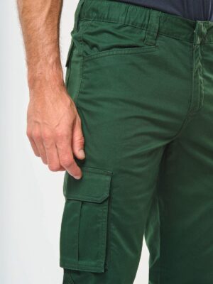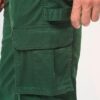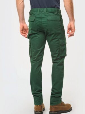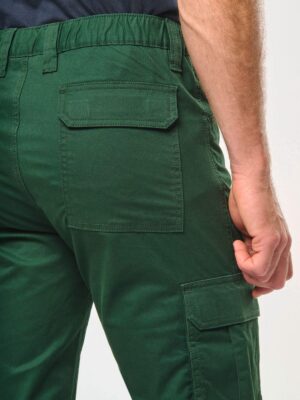 65% coton biologique / 33% polyester recyclé pré-consumer / 2% élasthanne. Tissu sergé. Lavage 60°C. Fermeture zippée et bouton métal caché. Ceinture élastiquée et passants pour plus de confort. Couture de l’entrejambe renforcée par une triple surpiqûre. 2 poches italiennes devant dont 1 avec poche monnaie dans sac de poche droit. 2 poches à soufflet côté et 2 poches arrière avec rabat et fermeture par bande auto-agrippante. Lien d’accrochage outils fixé sur poche arrière gauche. Lien d’accrochage ceinture intérieure. Couture de renfort sur poches pour plus de solidité. Finition double aiguille.