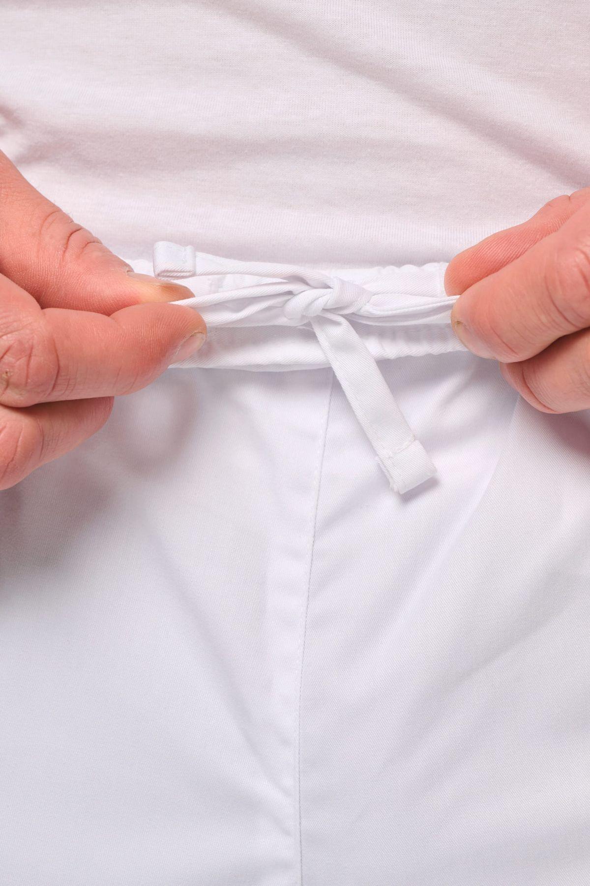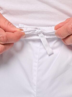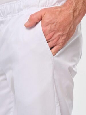 65% polyester / 35% coton. Tissu twill polycoton. Lavage 60°C. 2 poches italiennes côtés + 1 poche plaquée arrière avec renforts. Ceinture élastiquée avec cordon de serrage à l’intérieur. Etiquette de marque Tear Away.