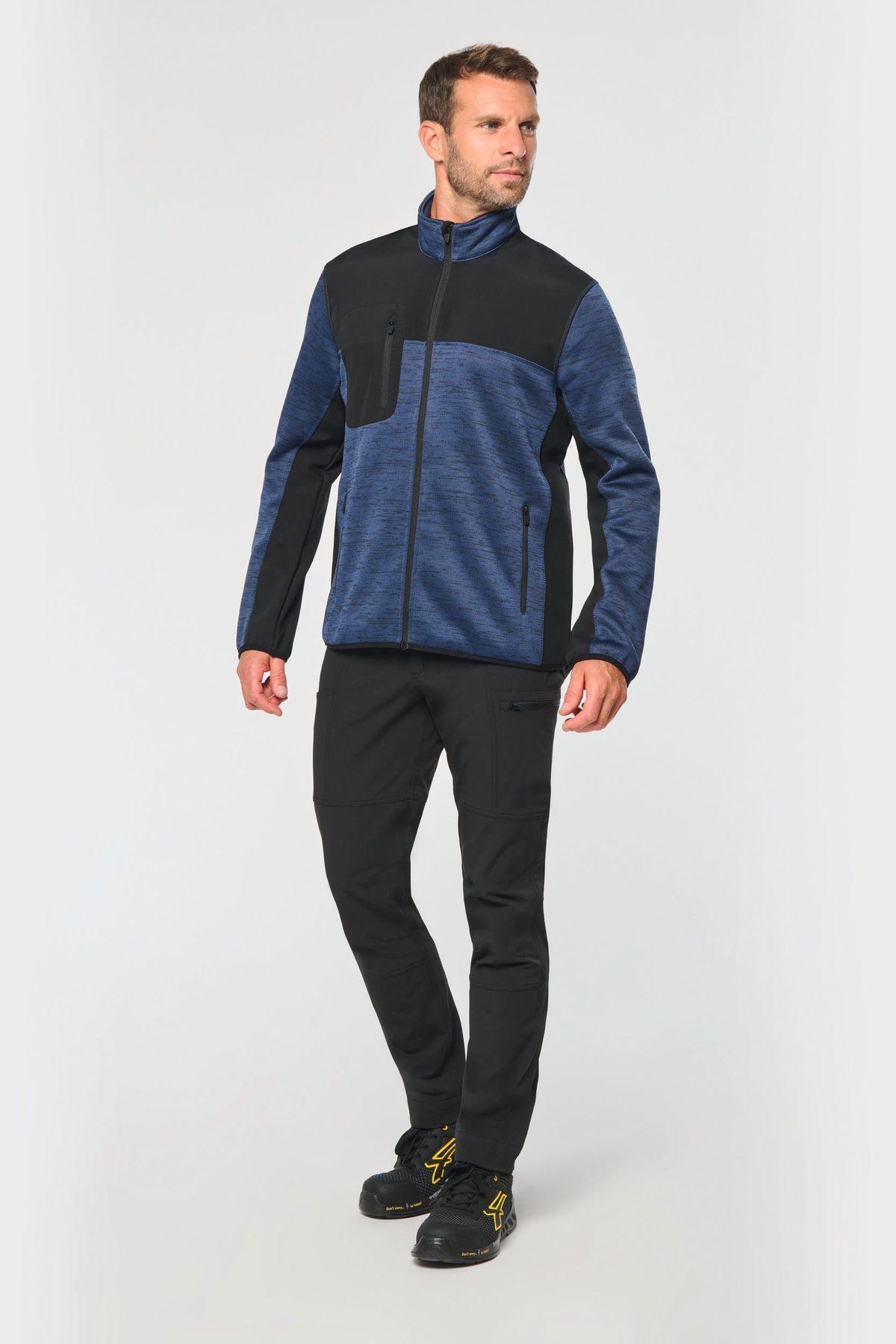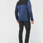 100% polyester recyclé. Maille polytricot grattée. Lavage 40°C. Empiècements en softshell contrastée 2 couches 100% polyester avec traitement déperlant sur haut du corps devant et dos, côtés et dessous de manches. Fermeture zippée avec protège menton. 2 poches côtés zippées. 1 poche plaquée poitrine contrastée zippée côté droit au porté. 2 poches intérieures. Finitions biais contrastés au bas de manches et bas de vêtement. Etiquette de marque détachable.