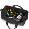 100% polyester. Sac à outils en polyester avec fond plastique. Grande ouverture unique en haut pour faciliter la recherche des outils. Sangles latérales pour assurer la solidité de la structure même avec un poids relatif et pour accueillir le niveau à bulle. Bandoulière réglable.