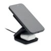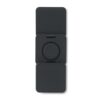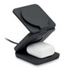 Station de charge pliable 3 en 1 en ABS recyclé caoutchouté. Elle comprend un chargeur magnétique sans fil 15W, un chargeur pour smartwatch (Apple® uniquement) et un chargeur TWS.