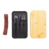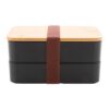 Boîte à lunch en plastique PP avec set de couverts (fourchette, cuillère et couteau), couvercle en bambou et sangle élastique. Avec 2 compartiments de 700 ml chacun. Matieres : : Plastique (PP) , Bambou . Passe au lave-vaisselle : Oui – sans les accessoires Passe au micro-ondes : Oui – sans les accessoires.