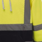 100% polyester anti-boulochage. 2 bandes réfléchissantes (largeur 5 cm) autour du corps et des bras. Une bretelle réfléchissante sur chaque épaule. Bande de propreté à l’encolure. Capuche attenante (dans la prolongation du col) avec cordon de serrage. Manches montées. Poche kangourou devant. Bas de manches et bas de vêtement en bord-côte. Finition double aiguille col, bas de manches et de vêtement. Hi-Vis Yellow, Hi-Vis Orange, Hi-Vis yellow/Navy, Hi-Vis Orange/Navy conforment à la norme EN ISO 20471 de catégorie 3.