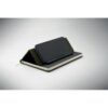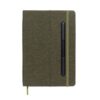 Carnet A5 avec couverture rigide en RPET et fonction support de téléphone. Stylo-bille 2-en-1 intégré en ABS. Reliure dos collé. 192 pages lignées en papier recyclé (96 feuilles). Elastique et marque-page assortis.